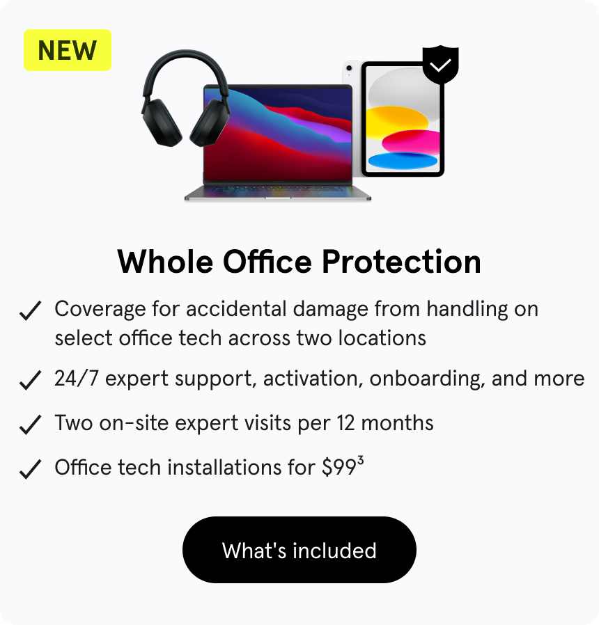 3 Office product installations are available in select locations for select products, which are subject to change at any time. Products must be new or fully functioning at the time of installation, and Wi-Fi access must be available for certain products to be installed. Availability of installation services is contingent on certain criteria, including product type, customer location and appointment/technician availability.